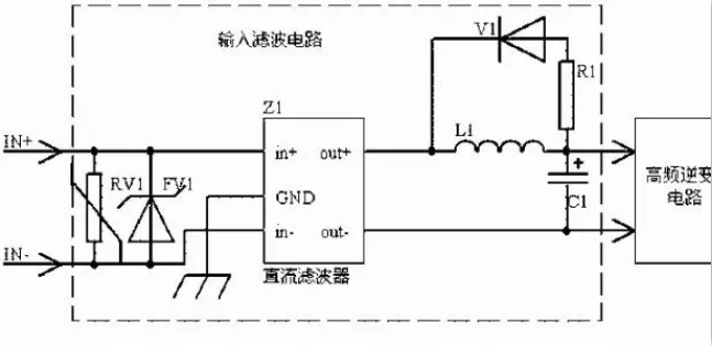 如圖所示,FV1為瞬態(tài)電壓抑制二極管,RV1為壓敏電阻,都具有很強(qiáng)的瞬變浪涌電流的吸收能力,能很好的保護(hù)后級(jí)元件或電路免遭浪涌電壓的破壞。Z1為直流EMI濾波器,必須良好接地,接地線要短,最好直接安裝在金屬外殼上,還要保證其輸入、輸出線之間的屏蔽隔離,才能有效的切斷傳導(dǎo)干擾沿輸入線的傳播和輻射干擾沿空間的傳播。L1、C1組成低通濾波電路,當(dāng)L1電感值較大時(shí),還需增加如圖所示的V1和R1元件,形成續(xù)流回路吸收L1斷開(kāi)時(shí)釋放的電場(chǎng)能,否則L1產(chǎn)生的電壓尖峰就會(huì)形成電磁干擾,電感L1所使用的磁芯最好為閉合磁芯,帶氣隙的開(kāi)環(huán)磁芯的漏磁場(chǎng)會(huì)形成電磁干擾,C1的容量較大為好,這樣可以減小輸入線上的紋波電壓,從而減小輸入導(dǎo)線周圍形成的電磁場(chǎng)。點(diǎn)擊進(jìn)入看圖評(píng)論DC/DC變換器輸入濾波電路2.高頻逆變電路的電磁兼容設(shè)計(jì),如圖所示,C2、C3、V2、V3組成的半橋逆變電路,V2、V3為IGBT、MOSFET等開(kāi)關(guān)元件,在V2、 V3開(kāi)通和關(guān)斷時(shí),由于開(kāi)關(guān)時(shí)間很快以及引線電感、變壓器漏感的存在,回路會(huì)產(chǎn)生較高的di/dt、dv/dt突變,從而形成電磁干擾,為此在變壓器原邊 兩端增加R4、C4構(gòu)成的吸收回路,或在V2、V3兩端分別并聯(lián)電容器C5、C6,并縮短引線,減小ab、cd、gh、ef的引線電感。在設(shè)計(jì)中,C4、 C5、C6一般采用低感電容,電容器容量的大小取決于引線電感量、回路中電流值以及允許的過(guò)沖電壓值的大小,LI2/2=C△V2/2公式求得C的大小, 其中L為回路電感,I為回路電流,△V為過(guò)沖電壓值。