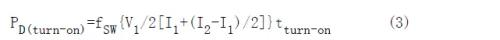 導(dǎo)通損耗可由開關(guān)兩端電壓和電流波形乘積測(cè)得。這些波形都近似線性,導(dǎo)通期間的功率損耗由式(1)給出。