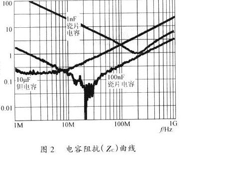 圖2是電容器在不同工作頻率下的阻抗(Zc)。