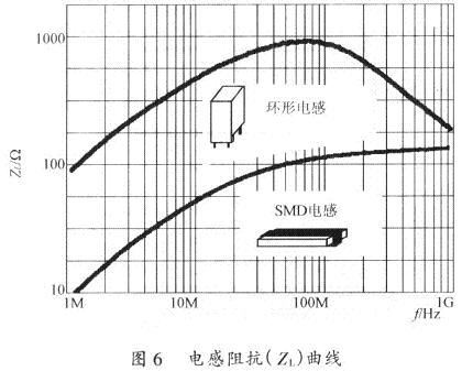 電感通常存在等效并聯(lián)電阻(EPR)和等效并聯(lián)電容(Cp)二個寄生參數。圖6是電感在不同工作頻率下的阻抗(ZL)。