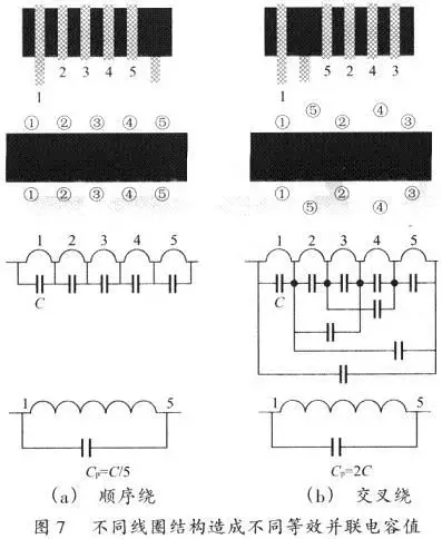 在開關電源中電感的Cp應該控制得越小越好。同時必須注意到,同一電感量的電感會由于線圈結構不同而產生不同的Cp值。圖7就顯示了同一電感量的電感在二種不同的線圈結構下不同的Cp值。圖7(a)電感的5匝繞組是按順序繞制。這種線圈結構的Cp值是l匝線圈等效并聯(lián)電容值(C)的1/5。圖7(b)電感的5匝繞組是按交叉順序繞制。其中繞組4和5放置在繞組1、2、3之間,而繞組l和5非常靠近。這種線圈結構所產牛的Cp是1匝線圈C值的兩倍。