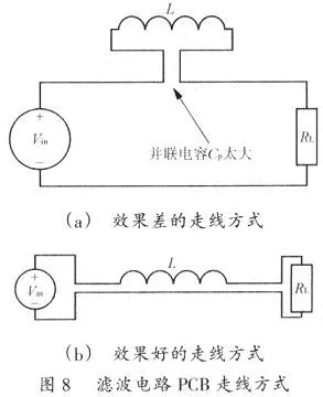 圖8顯示了在一個PCB上Vin通過L至負載(RL)的不同走線方式。為了降低電感的Cp,電感的二個引腳應盡量遠離。而Vin正極至RL和Vin負極至RL的走線應盡量靠近。