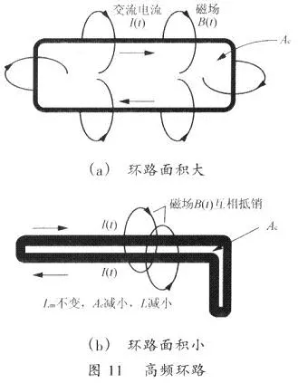 1.4高頻環(huán)路開關電源中有許多由功率器件所組成的高頻環(huán)路,如果對這△環(huán)路處嬋得不好的話,就會對電源的正常工作造成很大影響。為了減小高頻環(huán)路所產生的電磁波噪音,該環(huán)路的面積應該控制得非常小。如圖l1(a)所示,高頻電流環(huán)路面積很大,就會在環(huán)路的內部和外部產生很強的電磁于擾。同樣的高頻電流,當環(huán)路面積設計得非常小時,如圖11(b)所示,環(huán)路內部和外部電磁場互相抵消,整個電路會變得非常安靜。