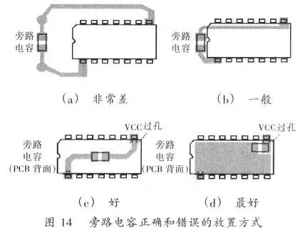 旁路電容(Decouple)的放置也要考慮到它的串聯(lián)電感值。旁路電容必須是低阻抗和低ESL乩的瓷片電容。但如果一個高品質瓷片電容在PCB上放置的方式不對,它的高頻濾波功能也就消失了。圖14顯示了旁路電容正確和錯誤的放置方式。