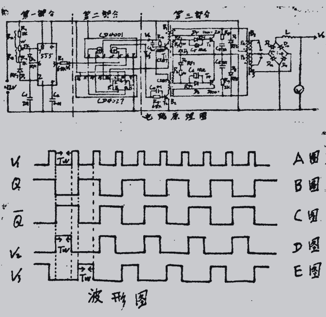 第二部分:這部分是由JK觸發(fā)器CD4027(只用一個(gè)y和四個(gè)輸入或非門CD4001(只用2個(gè))組成。這部分電路完成脈沖信號(hào)的邏輯關(guān)系。V作為K觸發(fā)器的時(shí)鐘信號(hào)。每當(dāng)時(shí)鐘信號(hào)的下降沿到來時(shí),JK觸發(fā)器的Q端和Q端電平都將發(fā)生反轉(zhuǎn),如圖B和圖C。因?yàn)榛蚍情T的2角和5角信號(hào)為V,1角信號(hào)為Q.6角信號(hào)為Q,我們知道或非門只有輸人端同時(shí)為低電平時(shí).輸出才為高電平。所以3角輸出波形V如圖D.4角輸出波形V,如圖E,它們的脈沖寬度為Tw。