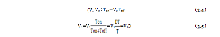 現(xiàn)在來講講開關(guān)電源的電路工作原理:Boost電路即升壓電路,當(dāng)Q1導(dǎo)通時,能量從輸入電源流入儲存于電感L1中,此刻二極管D1反偏,負(fù)載由濾波電容C1供給能量,將C1中儲存的電能(C1V02/2)釋放給負(fù)載R1。當(dāng)Q1截止時,電感L1中電流不能突變,此刻二極管D1導(dǎo)通,電感中儲存的能量(L1I2/2)經(jīng)二極管D1,流入電容C1,并供給負(fù)載R1。依據(jù)電感的伏秒平衡,在一個周期內(nèi)電感的伏秒乘積和為零。如果Q1導(dǎo)通時間Ton越大,那么Q1截止時提供給負(fù)載的電壓就會越大。下面通過具體的計算來加深了解:根據(jù)伏秒平衡有式(2-2)、(2-3)