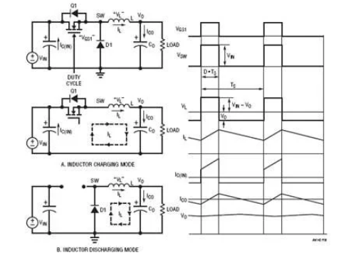 圖8閃現(xiàn)的最簡(jiǎn)略常用的開(kāi)關(guān)電源穩(wěn)壓器降壓型DC/DC轉(zhuǎn)換器。它有兩種操作形式,具體取決于晶體管Q1是敞開(kāi)仍是封閉。為了簡(jiǎn)化討論,假定一切電源設(shè)備都是志向設(shè)備。當(dāng)開(kāi)關(guān)電源(晶體管)Q1敞開(kāi)時(shí),開(kāi)關(guān)電源節(jié)點(diǎn)電壓VSW=VIN,電感L電流由(VIN–VO)充電。圖8(a)閃現(xiàn)此電感充電形式下的等效電路。當(dāng)開(kāi)關(guān)電源Q1封閉時(shí),電感電流通過(guò)續(xù)流二極管D1,如圖8(b)所示。開(kāi)關(guān)電源節(jié)點(diǎn)電壓VSW=0V,電感L電流由VO負(fù)載放電。因?yàn)橹鞠螂姼性诜€(wěn)態(tài)下不可能有直流電壓,均勻輸出電壓VO可通過(guò)以下公式算出: