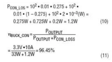 例如,12V輸入、3.3V/10AMAX輸出降壓電源可使用以下元件:MOSFETRDS(ON)=10mΩ,電感RDCR=2mΩ,二極管正向電壓VD=0.5V。因此,滿(mǎn)負(fù)載下的傳導(dǎo)損耗為: