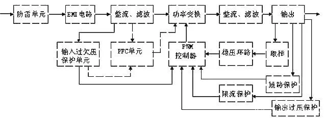 開關(guān)電源的主要電路是由輸入電磁攪擾濾波器(EMI)、整流濾波電路、功率變換電路、PWM控制器電路、輸出整流濾波電路組成。輔助電路有輸入過欠壓維護(hù)電路、輸出過欠壓維護(hù)電路、輸出過流維護(hù)電路、輸出短路維護(hù)電路等組成的。