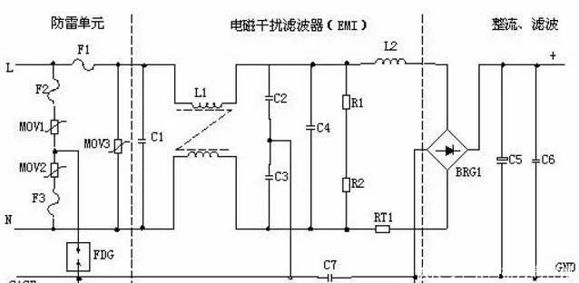②輸入濾波電路:C1、L1、C2、C3組成的雙π型濾波網(wǎng)絡(luò)主要是對(duì)輸入電源的電磁噪聲及雜波信號(hào)進(jìn)行抑制,防止對(duì)電源干擾,同時(shí)也防止電源本身產(chǎn)生的高頻雜波對(duì)電網(wǎng)干擾。當(dāng)電源開啟瞬間,要對(duì)C5充電,由于瞬間電流大,加RT1(熱敏電阻)就能有效的防止浪涌電流。因瞬時(shí)能量全消耗在RT1電阻上,一定時(shí)間后溫度升高后RT1阻值減?。?/span>RT1是負(fù)溫系數(shù)元件),這時(shí)它消耗的能量非常小,后級(jí)電路可正常工作。