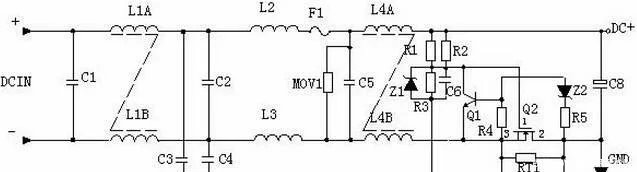 ②R1、R2、R3、Z1、C6、Q1、Z2、R4、R5、Q2、RT1、C7組成抗浪涌電路。在起機(jī)的瞬間,由于C6的存在Q2不導(dǎo)通,電流經(jīng)RT1構(gòu)成回路。當(dāng)C6上的電壓充至Z1的穩(wěn)壓值時(shí)Q2導(dǎo)通。如果C8漏電或后級(jí)電路短路現(xiàn)象,在起機(jī)的瞬間電流在RT1上產(chǎn)生的壓降增大,Q1導(dǎo)通使Q2沒有柵極電壓不導(dǎo)通,RT1將會(huì)在很短的時(shí)間燒毀,以保護(hù)后級(jí)電路。