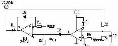 當(dāng)輸出電路短路,輸出電壓消失,光耦OT1不導(dǎo)通,UC3842①腳電壓上升至5V左右,R1與R2的分壓超過TL431基準(zhǔn),使之導(dǎo)通,UC3842⑦腳VCC電位被拉低,IC停止工作。UC3842停止工作后①腳電位消失,TL431不導(dǎo)通UC3842⑦腳電位上升,UC3842重新啟動(dòng),周而復(fù)始。當(dāng)短路現(xiàn)象消失后,電路可以自動(dòng)恢復(fù)成正常工作狀態(tài)。