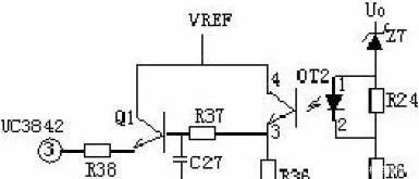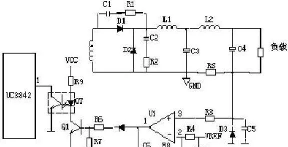 輸出限壓保護(hù)電路:輸出限壓保護(hù)電路如下圖,當(dāng)輸出電壓升高,穩(wěn)壓管導(dǎo)通光耦導(dǎo)通,Q1基極有驅(qū)動(dòng)電壓而道通,UC3842③電壓升高,輸出降低,穩(wěn)壓管不導(dǎo)通,UC3842③電壓降低,輸出電壓升高。周而復(fù)始,輸出電壓將穩(wěn)定在一范圍內(nèi)(取決于穩(wěn)壓管的穩(wěn)壓值)。