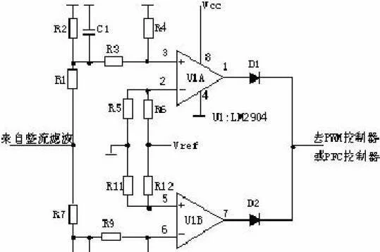 AC輸入和DC輸入的開關(guān)電源的輸入過欠壓保護(hù)原理大致相同。保護(hù)電路的取樣電壓均來自輸入濾波后的電壓。取樣電壓分為兩路,一路經(jīng)R1、R2、R3、R4分壓后輸入比較器3腳,如取樣電壓高于2腳基準(zhǔn)電壓,比較器1腳輸出高電平去控制主控制器使其關(guān)斷,電源無輸出。另一路經(jīng)R7、R8、R9、R10分壓后輸入比較器6腳,如取樣電壓低于5腳基準(zhǔn)電壓,比較器7腳輸出高電平去控制主控制器使其關(guān)斷,電源無輸出。