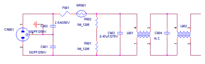 c901、C902為共模電容,首要按捺差模干擾,即前方和零線別離與地之間的干擾。電容值愈大對(duì)低頻干擾按捺作用愈好,在這里選用102PF/250V。
