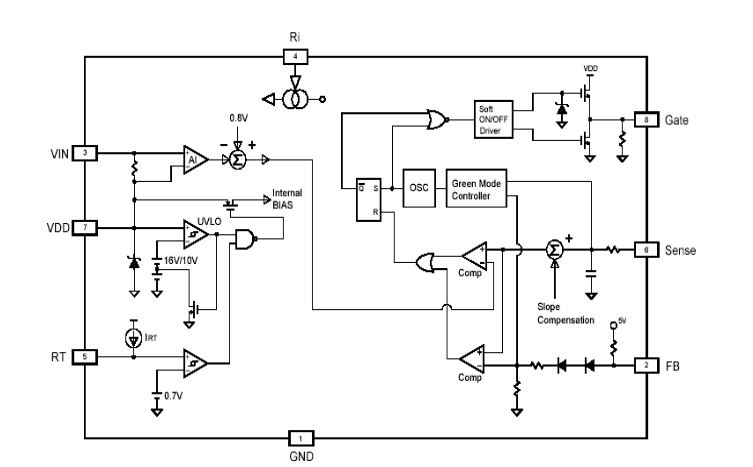 5.內(nèi)建電壓補(bǔ)償電路可在一個(gè)較大的AC輸入范圍內(nèi)完成功率限制操控,并供給過(guò)載、短路維護(hù)功用。此外,還設(shè)有低電壓鎖定(UVLO)功用,使作業(yè)更穩(wěn)定、牢靠。