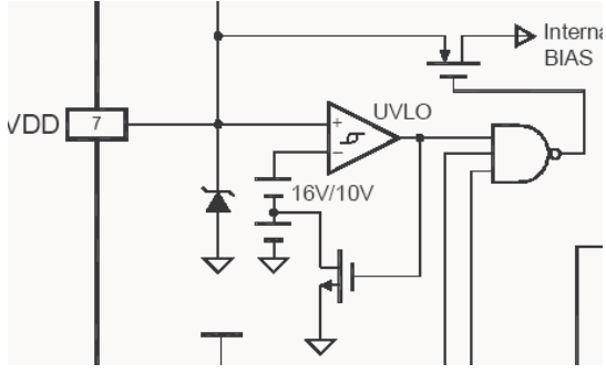 SG6841采用了欠壓鎖定比較器來(lái)確保輸出級(jí)被驅(qū)動(dòng)之前,集成電路已完全可用。欠壓鎖定回路其實(shí)質(zhì)是一個(gè)滯回比較器,以防止在通過(guò)它們各自的門限時(shí)產(chǎn)生過(guò)錯(cuò)的輸出動(dòng)作。它的開(kāi)啟電壓為16V,關(guān)閉電壓為10V。在啟動(dòng)過(guò)程中,比較器反向輸入端為16V,當(dāng)VDD<16V時(shí),比較器輸出為低電平,SG6841無(wú)法工作。當(dāng)VDD升到16V時(shí),欠壓鎖定器輸出為高電平,SG6841正常工作,同時(shí)MOS管導(dǎo)通,使比較器反向輸入端為10V。當(dāng)VDD下降至10V時(shí),欠壓鎖定器的輸出回到低電平,整個(gè)電路停止工作.SG6841的7腳端設(shè)置了一個(gè)32V的齊納二極管,確保內(nèi)部電路肯定工作在32V以下,以防電壓過(guò)高損壞芯片。