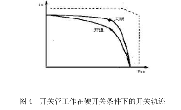 (d)二極管反向恢復(fù)問題:二極管由導(dǎo)通變?yōu)榻刂箷r存在著反向恢復(fù)期,在此期間內(nèi),二極管仍處于導(dǎo)通狀況,若當(dāng)即注冊與其串聯(lián)的開關(guān)器材,簡單造成直流電源瞬間短路,發(fā)生很大的沖擊電流,輕則引起該開關(guān)器材和二極管耗急劇添加,重則致其損壞。圖4給出了接理性負載時,開關(guān)管作業(yè)在硬開關(guān)條件下的開關(guān)的開關(guān)軌道,圖中虛線為雙極性晶體管的安全作業(yè)區(qū)(Safetyoperation area,SOA),如果不改進開關(guān)管的開關(guān)條件,其開關(guān)軌道很可能會超出安全作業(yè)區(qū),導(dǎo)致開關(guān)管的損壞。