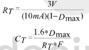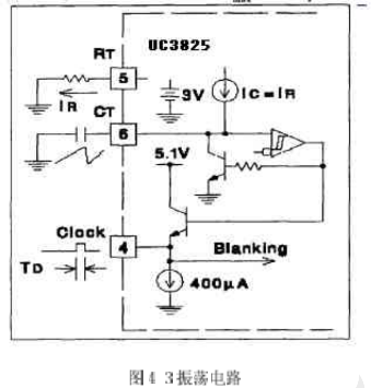 振蕩電路如圖4-3所示。UC3823A、B和UC3825A、B內(nèi)部都有一個鋸齒波振蕩器。鋸齒波上升沿的斜率由RT、Cr決定,確定RT、CT的方法是:首先根據(jù)要求的最大占空比Dmax、選擇RT,再根據(jù)要求的頻率以及RT和Dmax選擇CT計算公式為: