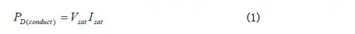 導通損耗可由開關兩頭電壓和電流波形乘積測得。這些波形都近似線性,導通期間的功率損耗由式(1)給出。