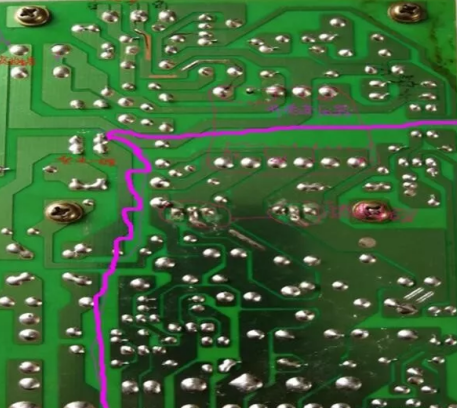 220V交流輸入,通過保險(xiǎn),負(fù)溫度熱敏電阻,安規(guī)電容,共模電感組成的抗電磁干擾電路及過流保護(hù)電路,經(jīng)過整流二極管整流濾波后輸出300V左右的直流電壓。這是電源板正面圖,用紅線畫出的部分為熱地與冷地部分(開關(guān)電源接地方式有熱地和冷地之分,與220V電源直接相連的地稱為熱地,人體直接接觸會(huì)觸電;經(jīng)開關(guān)變壓器隔離后,再整流濾波后的地稱為冷地,人體直接接觸不會(huì)觸電)。這是電路板背面圖,在圖中標(biāo)出開關(guān)電源的輸入部分、300V濾波大電容、開關(guān)管、開關(guān)變壓器、肖特基二極管等主要元器件。
