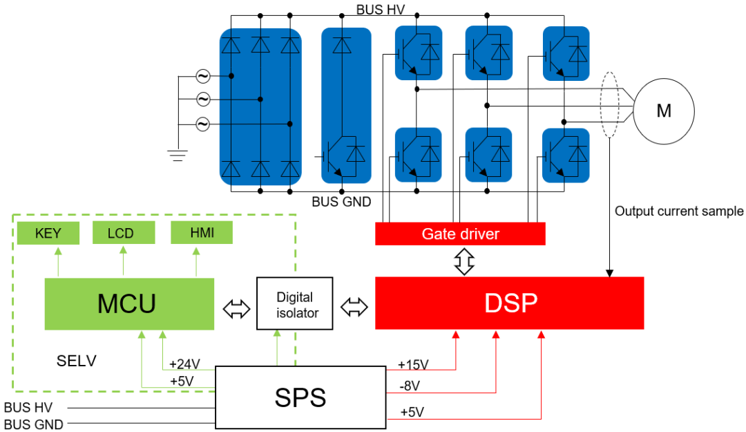 如圖4所示三相變頻器中,左下角綠色虛線圍起來(lái)的部分就是SELV電路,輔助開關(guān)電源SPS左側(cè)的供給MCU的+24V,+5V兩路開關(guān)電源與SPS的其余的電壓輸入輸出電氣連接點(diǎn)之間,都必須滿足加強(qiáng)絕緣要求。