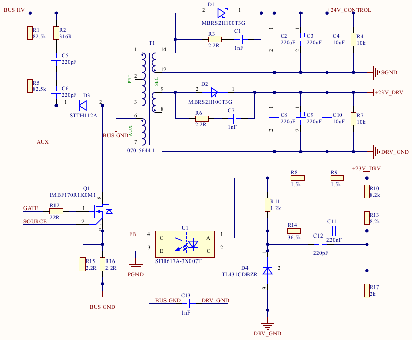 假設(shè)輔助開關(guān)電源SPS采用了經(jīng)典的單管反激變換器,如圖5所示,SPS從變頻器的BUS電容上取電,這里為了簡(jiǎn)化電路,變壓器T1的輸出只設(shè)計(jì)了兩路輸出電壓,分別給IGBT的驅(qū)動(dòng)器和MCU側(cè)供電,從前面的定義可以看出,給MCU供電的+24V_CONTROL就是SELV電路,需要與其他電路之間做加強(qiáng)絕緣處理,也就是變壓器T1的pin12-pin14所在的繞組與其余繞組之間必須滿足加強(qiáng)絕緣要求,同時(shí),在PCB板上,+24V_CONTROL所在電路與其他電路之間的爬電距離也必須滿足加強(qiáng)絕緣要求。