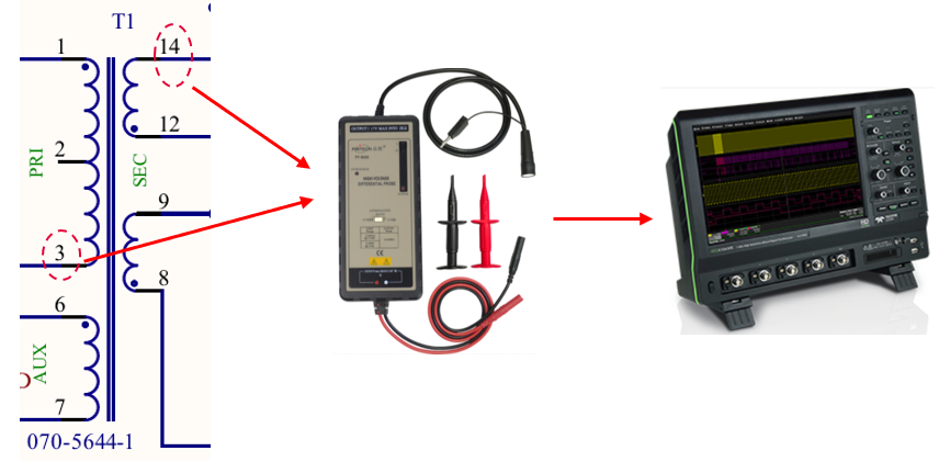 回到本文的重點(diǎn),接下來(lái)測(cè)試一次側(cè)高壓端與SELV電路之間的重復(fù)峰值電壓是否超過(guò)750V閾值電壓。有經(jīng)驗(yàn)的同學(xué)都知道,在開關(guān)電源中,重點(diǎn)是要找到變換器中的“動(dòng)點(diǎn)”,也就是電壓的變化率dv/dt最大的節(jié)點(diǎn),在圖5中,一次側(cè)高壓端的監(jiān)測(cè)點(diǎn)就可以選為Q1的Drain極,也就是變壓器T1的pin 3,安全二次側(cè)SELV的監(jiān)測(cè)點(diǎn)既可以選擇變壓器T1的pin 12,也可以選擇變壓器T1的pin 14,最后以正常帶載工況下一次側(cè)、二次側(cè)之間檢測(cè)到最大電壓為作為設(shè)定局部放電電壓UPD的基準(zhǔn)。