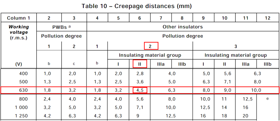 3、增加氣隙長(zhǎng)度和爬電距離,以降低電場(chǎng)強(qiáng)度。以圖7中測(cè)得的UPD電壓有效值559Vrms去查詢對(duì)應(yīng)的加強(qiáng)絕緣爬電距離要求,如圖14所示,在污染等級(jí)為Ⅱ類,采用600>CTI≥400的絕緣材料的條件下,基本絕緣的爬電距離要求為4.5mm,則滿足加強(qiáng)絕緣要求的爬電距離至少為基本絕緣爬電距離要求的2倍,也就是要大于9mm。