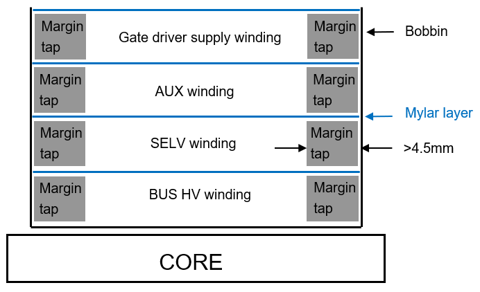另外,SELV繞組的出線,除了需要用鐵氟龍?zhí)坠艽┕芡猓ㄗh最好不要與一次側(cè)高壓繞組的出線端交叉。