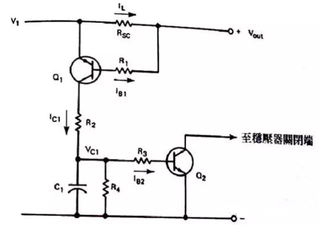 工作原理是:在正常的工作情況下,流入到Rsc上的Il不會產生很大的壓降,那么就不會使Q1導通,若負載電流足夠大就會在Rsc上產生電壓,使Q1導通。若Q1在OFF裝態(tài)時,而且Ic1=0時C1會全部放電掉,因此Q2也會處于OFF狀態(tài),如果Il電流逐漸增加時,則Il*Rsc=VbeQ1+Ib1R1,此時會集電極會有電流Ic1流過,并有下面的時間常數將C1充電T=R2*C1,那么C1上的電壓是:Vc1=Ib2R3+VbeQ2,為了使為了使電容器電壓的負載效應減到最低值,我們可選用具有較高的HFE的達林凳管子來代替Q2,這樣可以把基極電流限制在微安培,我門在選擇電阻R4時要遠遠大于R3。這樣當電流過載時,C1電容會快速放電。
