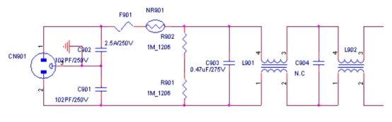 c901、C902為共模電容,首要克制差模攪擾,即前方和零線別離與地之間的攪擾。電容值愈大對(duì)低頻攪擾克制效果愈好,在這里選用102PF/250V。