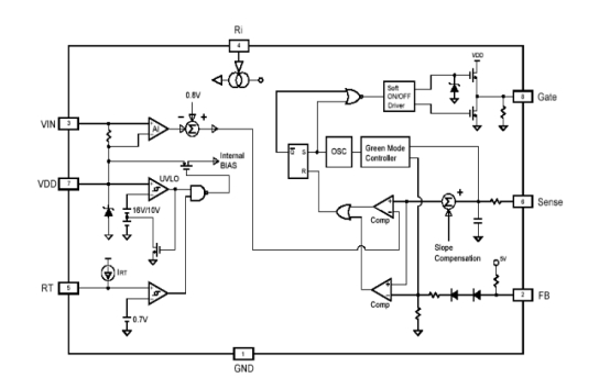 4.RI:參看設(shè)置端。經(jīng)過(guò)連接一個(gè)電阻接地來(lái)為SG6841供應(yīng)一個(gè)安穩(wěn)的電流,改動(dòng)電阻阻值將改動(dòng)PWM的頻率。