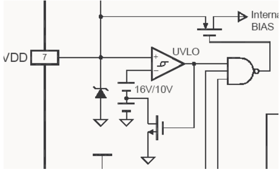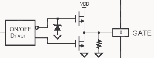 8. Gate:PWM脈沖輸出端。圖騰柱(即推拉輸出電路)輸出極驅(qū)動(dòng)功率開(kāi)關(guān)管。