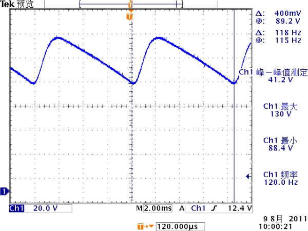 低頻紋波是與輸出電路的濾波電容容量相關(guān)。因為開關(guān)電源體積的約束,電解電容的容量不可能無約束地添加,導致輸出低頻紋波的殘留,該輸出紋波頻率隨整流電路方式的不同而不同。