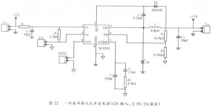 4、開關(guān)電源PCB排版例2圖22是另一種降壓式開關(guān)電源,該電源能使12V輸入電壓轉(zhuǎn)換成3.3V輸出電壓,輸出電流可達(dá)3A。此電源上運(yùn)用了一個(gè)集成電源控制器(Semtech類型SC4519)。這種控制器將一個(gè)功率管集成在電源控制器芯片中。這樣的電源非常簡(jiǎn)略,特別適宜應(yīng)用在便攜式DVD機(jī),ADSL,機(jī)頂盒等消費(fèi)類電子產(chǎn)品。