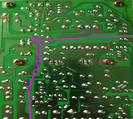 220V交流輸入,通過穩(wěn)妥,負(fù)溫度熱敏電阻,安規(guī)電容,共模電感組成的抗電磁干擾電路及過流保護電路,通過整流二極管整流濾波后輸出300V左右的直流電壓。這是電源板正面圖,用紅線畫出的部分為熱地與冷地部分(開關(guān)電源接地方式有熱地和冷地之分,與220V電源直接相連的地稱為熱地,人體直接觸摸會觸電;經(jīng)開關(guān)變壓器阻隔后,再整流濾波后的地稱為冷地,人體直接觸摸不會觸電)。這是電路板反面圖,在圖中標(biāo)出開關(guān)電源的輸入部分、300V濾波大電容、開關(guān)管、開關(guān)變壓器、肖特基二極管等首要元器材。