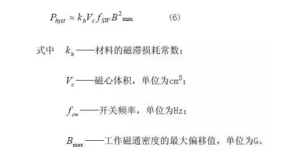 磁滯損耗與繞組的匝數(shù)和驅(qū)動辦法有關(guān)。它挑選了每個作業(yè)周期在B-H曲線內(nèi)掃過的面積。掃過的面積便是磁場力所作的功,磁場力使磁心內(nèi)的磁疇重新排列,掃過的面積越大,磁滯損耗就越大。該損耗由式(6)給出。