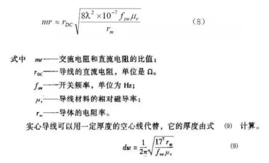 電阻損耗是變壓器或電感內(nèi)部繞組的電阻發(fā)生的損耗。有兩種方法的電阻損耗:直流電阻損耗和集膚效應(yīng)電阻損耗。直流電阻損耗由繞組導(dǎo)線的電阻與流過的電流有用值二次方的乘積所挑選。集膚效應(yīng)是由于在導(dǎo)線內(nèi)強溝通電磁場作用下,導(dǎo)線中心的電流被“面向”導(dǎo)線外表而使導(dǎo)線的電阻實踐增加所致,電流在更小的截面中活動使導(dǎo)線的有用直徑顯得小了。式(8)給出了這兩個損耗在一個表達式中的計算式。