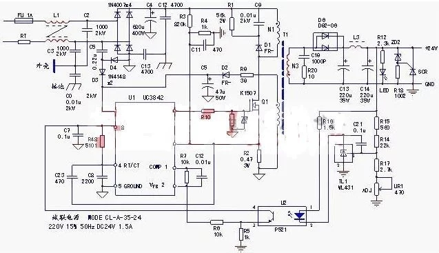 U1芯片和1、2腳外圍元件R7、C12,也是穩(wěn)壓回路的一部分。實際上,TL1、U1組成了(相對于U1內(nèi)部電壓差錯放大器)外部差錯放大器,將輸出24V的電壓改動反應回U1的反應電壓信號輸入端。