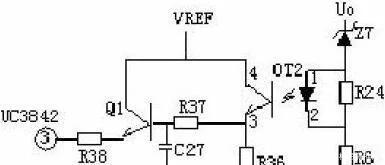 輸出限壓保護(hù)電路:輸出限壓保護(hù)電路如下圖,當(dāng)輸出電壓升高,穩(wěn)壓管導(dǎo)通光耦導(dǎo)通,Q1基極有驅(qū)動(dòng)電壓而道通,UC3842③電壓升高,輸出下降,穩(wěn)壓管不導(dǎo)通,UC3842③電壓下降,輸出電壓升高。循環(huán)往復(fù),輸出電壓將安穩(wěn)在一范圍內(nèi)(取決于穩(wěn)壓管的穩(wěn)壓值)。
