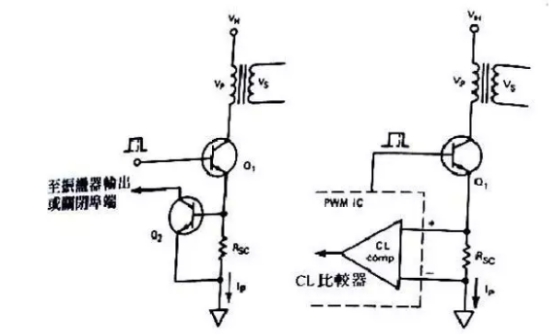 (a)圖:在輸出端有過載或短路情況發(fā)生時,此刻初級電流會很快的添加,Rsc上的就會發(fā)生電壓,此電壓逾越B-E的導通電壓,那么Q2就會導通,就會把Q2集電極電位拉到地,假設接的是震動電路此刻就會導至震動電路中止作業(yè),然后到達維護的意圖。