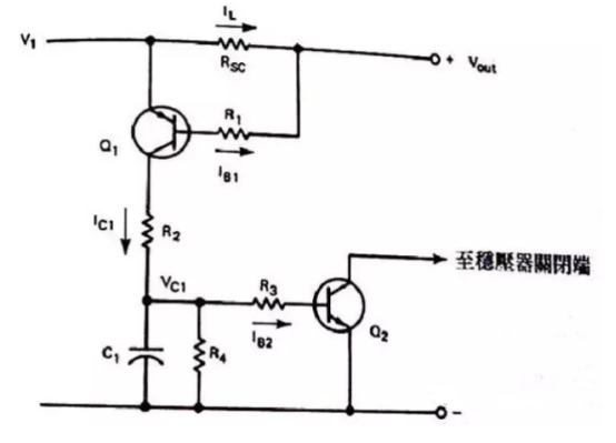 作業(yè)原理是:在正常的作業(yè)情況下,流入到Rsc上的Il不會發(fā)生很大的壓降,那么就不會使Q1導通,若負載電流足夠大就會在Rsc上發(fā)生電壓,使Q1導通。若Q1在OFF裝態(tài)時,而且Ic1=0時C1會全部放電掉,因此Q2也會處于OFF情況,假設Il電流逐步添加時,則Il*Rsc=VbeQ1+Ib1R1,此刻會合電極會有電流Ic1流過,并有下面的時間常數(shù)將C1充電T=R2*C1,那么C1上的電壓是:Vc1=Ib2R3+VbeQ2,為了使為了使電容器電壓的負載效應減到最低值,咱們可選用具有較高的HFE的達林凳管子來替代Q2,這樣可以把基極電流約束在微安培,我門在挑選電阻R4時要遠遠大于R3。這樣當電流過載時,C1電容會快速放電。