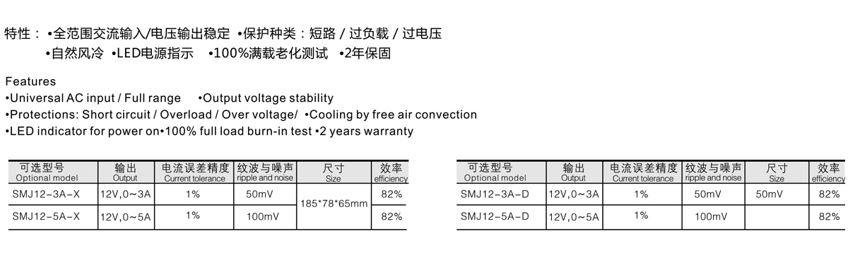 全范圍交流輸入/電壓輸出穩(wěn)定 有短路、過載、過熱保護(hù) 自然風(fēng)冷散熱 LED電源指示 100%滿負(fù)荷燒機(jī)測試